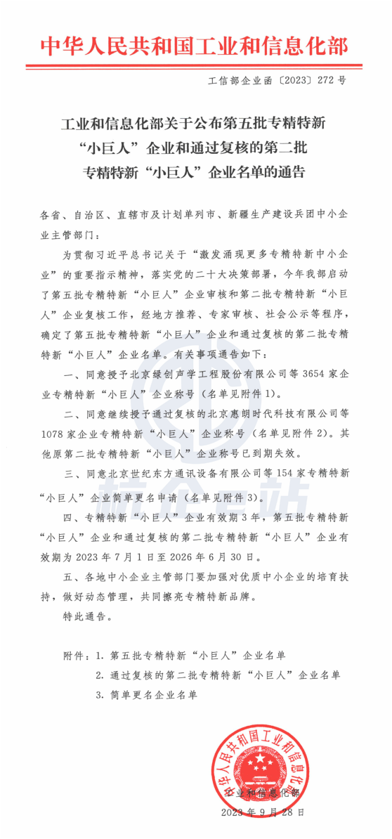 為深入貫徹習近平總書記關于“培育一批‘專精特新’中小企業”的重要指示精神,工業和信息化部開展了第五批專精特新“小巨人”企業培育和第二批專精特新“小巨人”企業復核工作,已完成相關審核,確定了第五批專精特新“小巨人”企業和通過復核的第二批專精特新“小巨人”企業名單。?